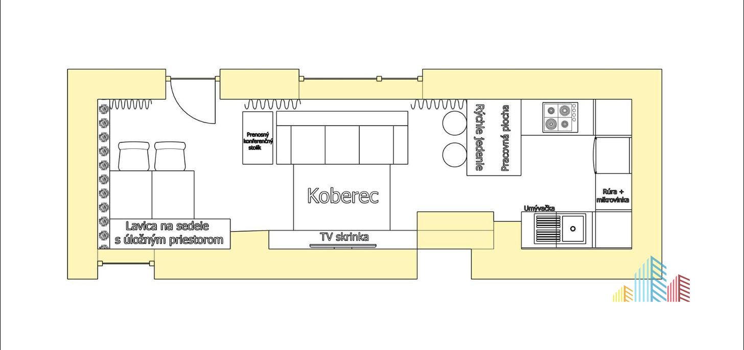 Dispozične pozostáva zo vstupnej chodby , kúpeľňa s WC, priestrannej kuchyne spojenej s jedálňou a obývačkou s výstupom na terasu. Súčasťou obytnej plochy sú 2 samostatné izby .