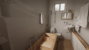 Na prvom podlaží sa nachádza: obývacia miestnosť, kuchyňa, spálňa a izba, kúpeľňa + WC.