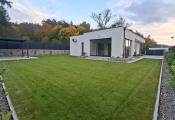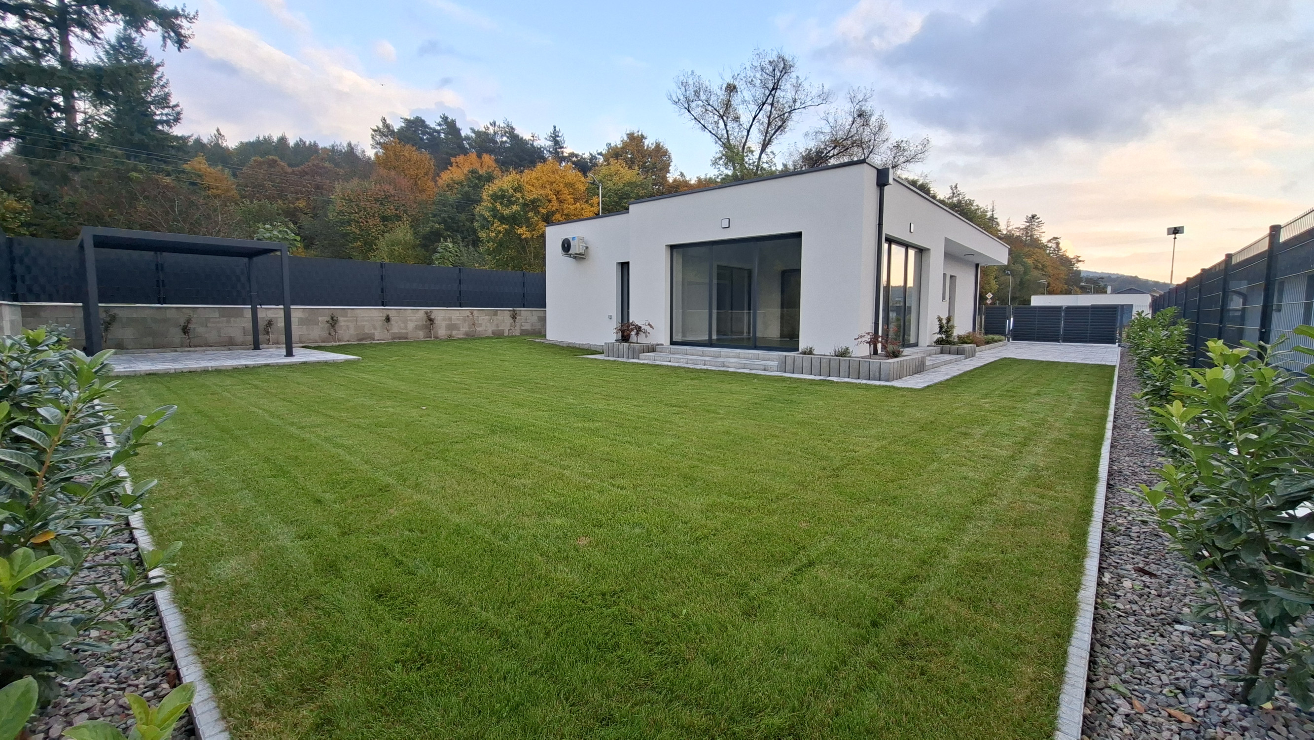 Presklená terasa s dlažbou, vonkajšie terénne úpravy vrátane zámkovej dlažby, trávnik, vysadené dreviny, zavlažovací systém, altánok, ...