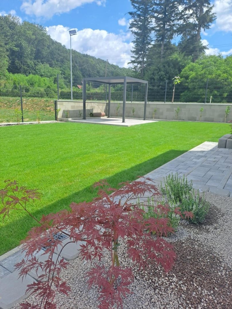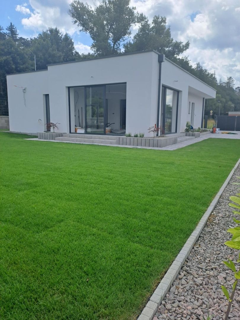 Presklená terasa s dlažbou, vonkajšie terénne úpravy vrátane zámkovej dlažby, trávnik, vysadené dreviny, zavlažovací systém, altánok, ...