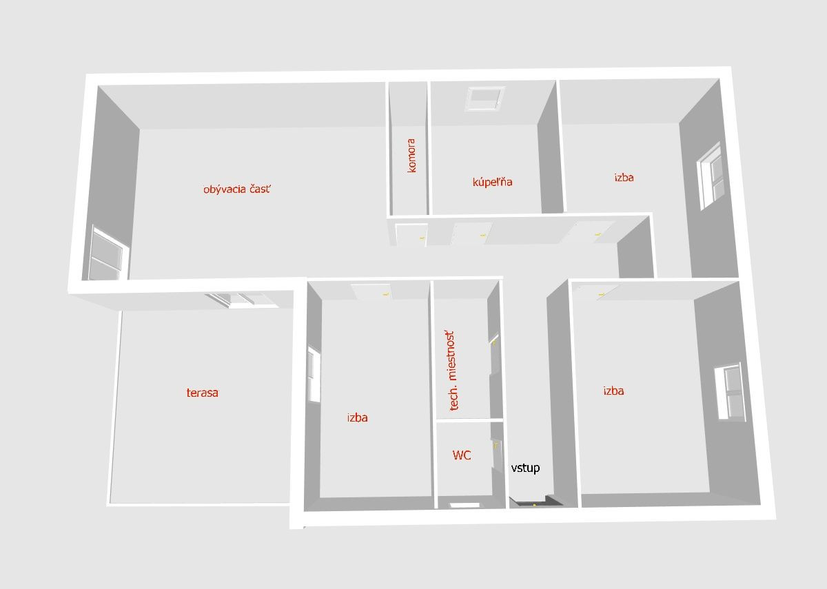 Dispozične pozostáva z vchodu, chodby, samostatné WC, kúpeľňa s WC , 3x izba, technická miestnosť, komora, obývacia časť s kuchyňou s východom na prestrešenú terasu .