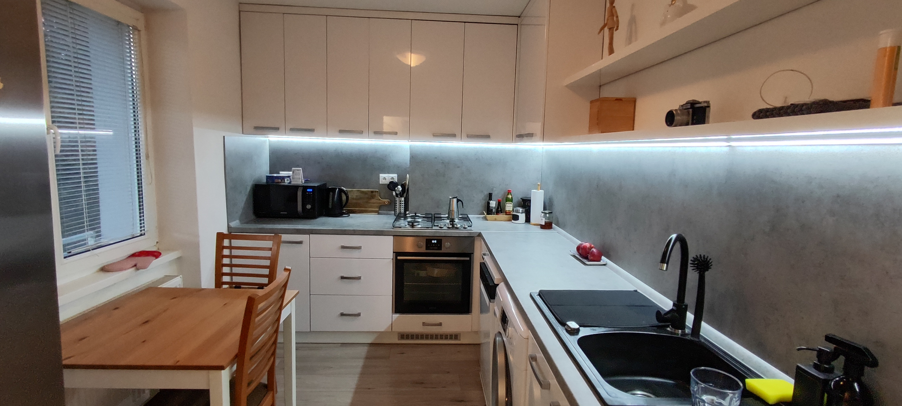 Byt sa predáva kompletne zariadený s výnimkou elektroniky, presne podľa aktuálnych fotografií. V byte sa nachádza nová moderná kuchynská linka na mieru v tvare L, ktorá je vybavená zabudovanými spotrebičmi vrátane umývačky riadu, práčky, kombinovaného sporáka a chladničky s mrazničkou. Všetok nábytok a zariadenie zostáva súčasťou predaja, čo umožňuje novému majiteľovi okamžité zabývanie bez nutnosti riešiť základné vybavenie domácnosti.