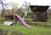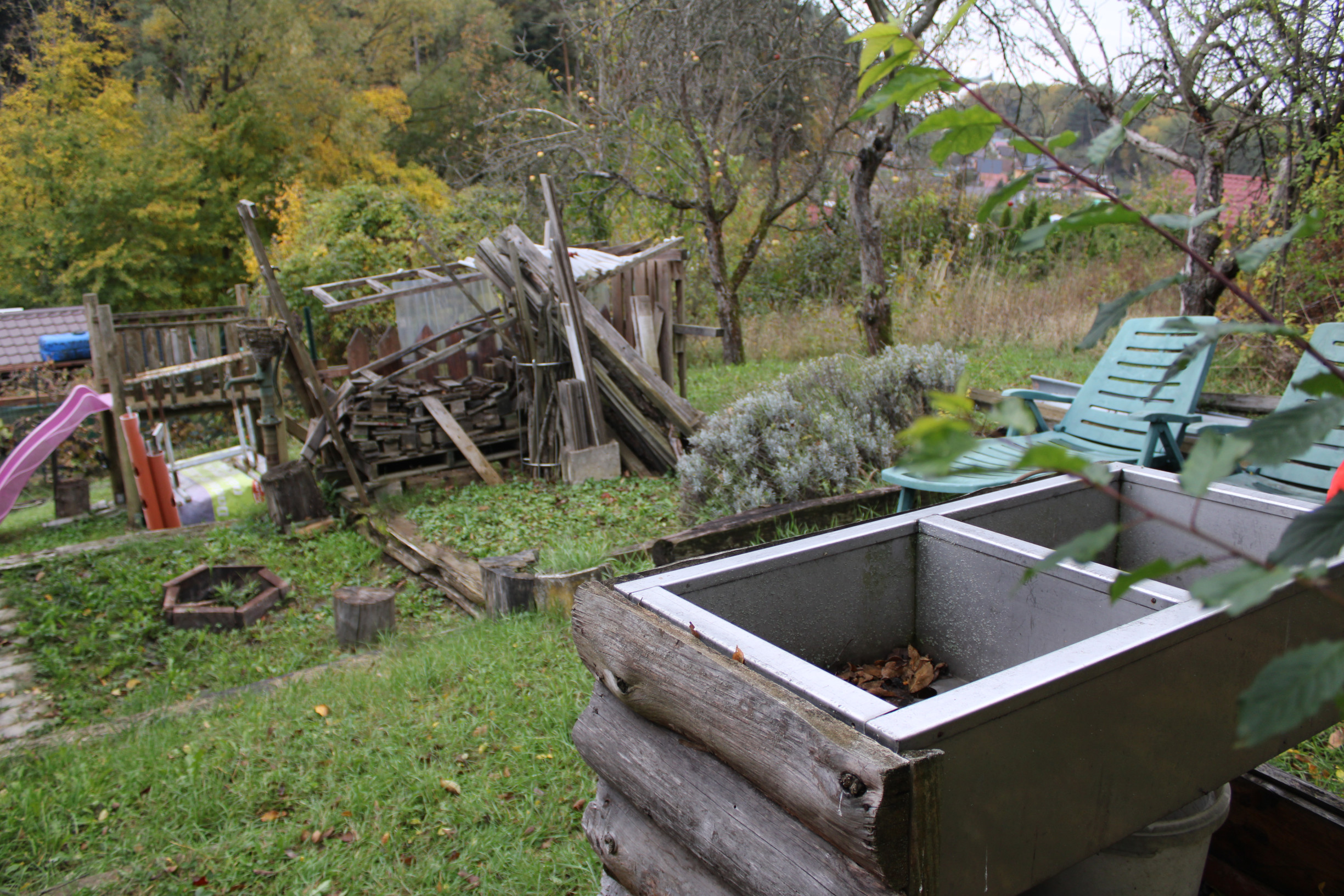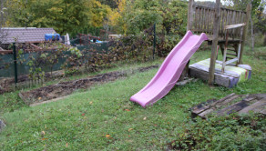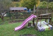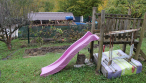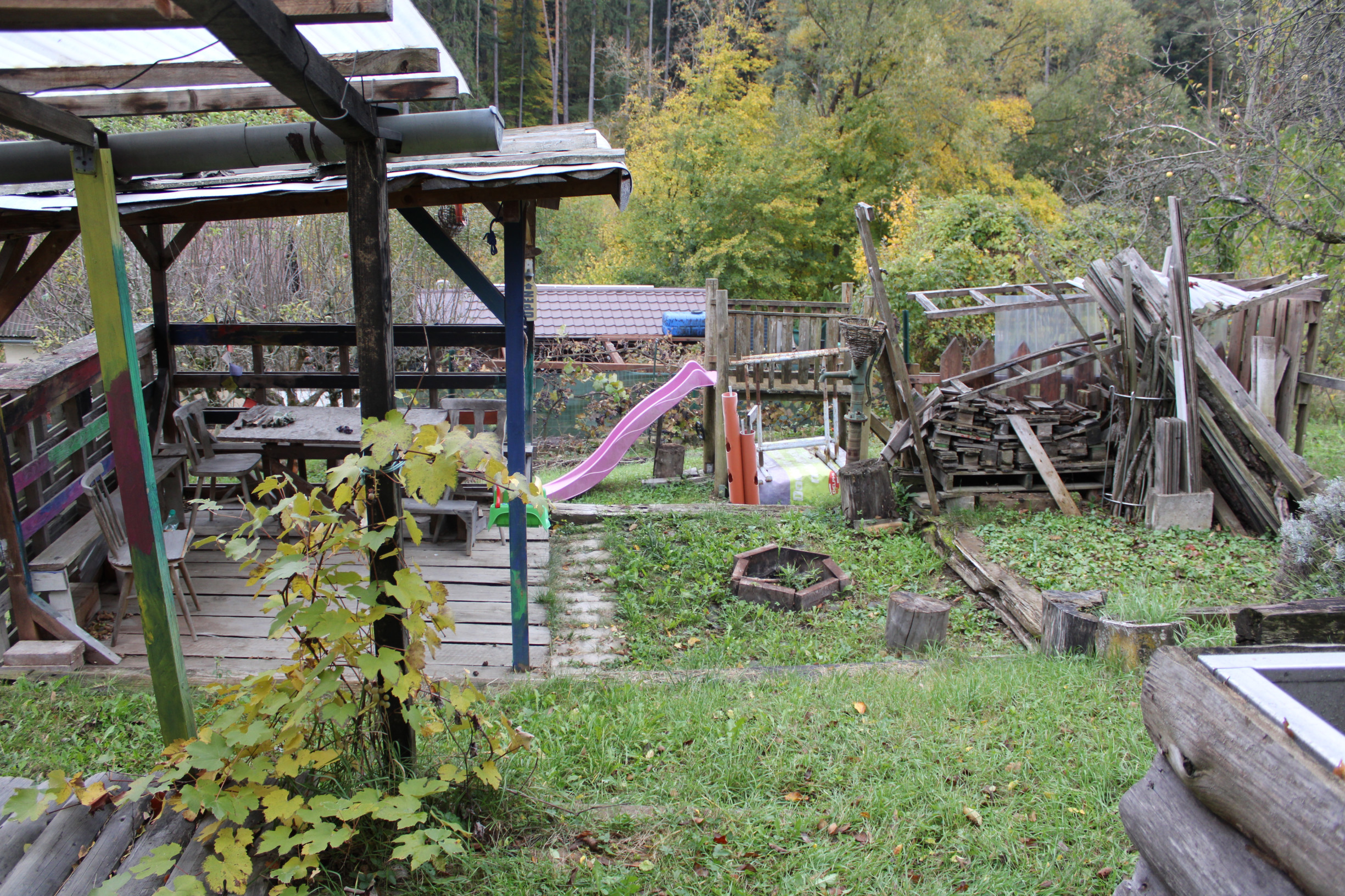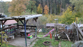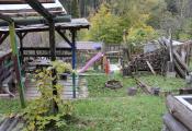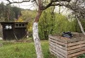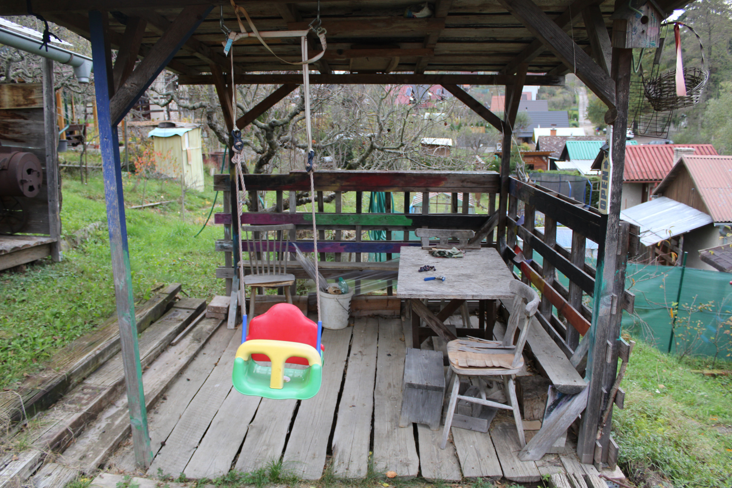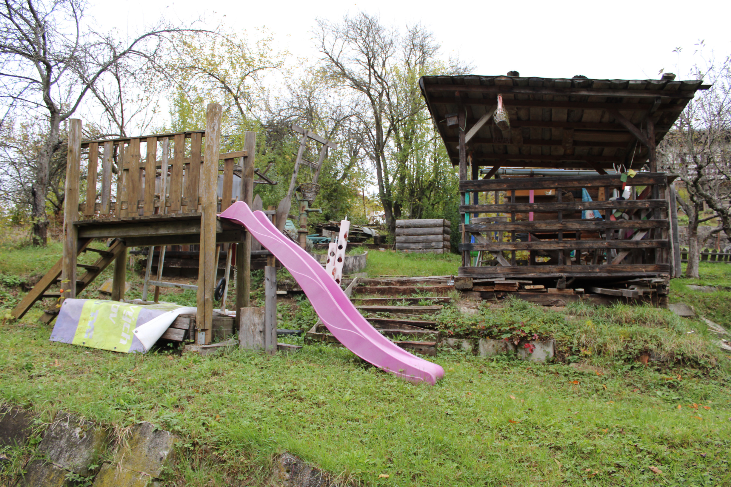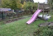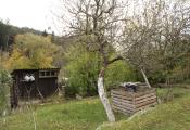 Kaskádovitý terén je rozdelený do viacerých úrovní s premyslene vytvorenými terasami - na jednej sa nachádzajú pripravené záhony ideálne na pestovanie, druhá terasa je vybavená detskou šmýkaľou a pieskom pre najmenších, a tretia terasa hostí útulný altánok s ohniskom na príjemné večerné posedenia. Pozemok je vybavený praktickým dreveným domčekom na náradie s pripojeným zastrešeným priestorom vhodným na odpočinok či grilovanie. Hoci priame elektrické pripojenie nie je k dispozícii, možno využiť centrálu alebo náradie na batérie či benzín, prípadne si požičať elektriku z hlavnej budovy a natiahnúť kábel priamo na pozemok. Na pozemku sa nachádza úžitková voda na polievanie, pitná voda sa náchadza kúsok od zahrady.