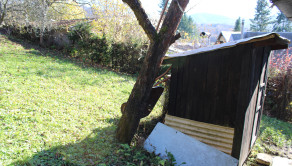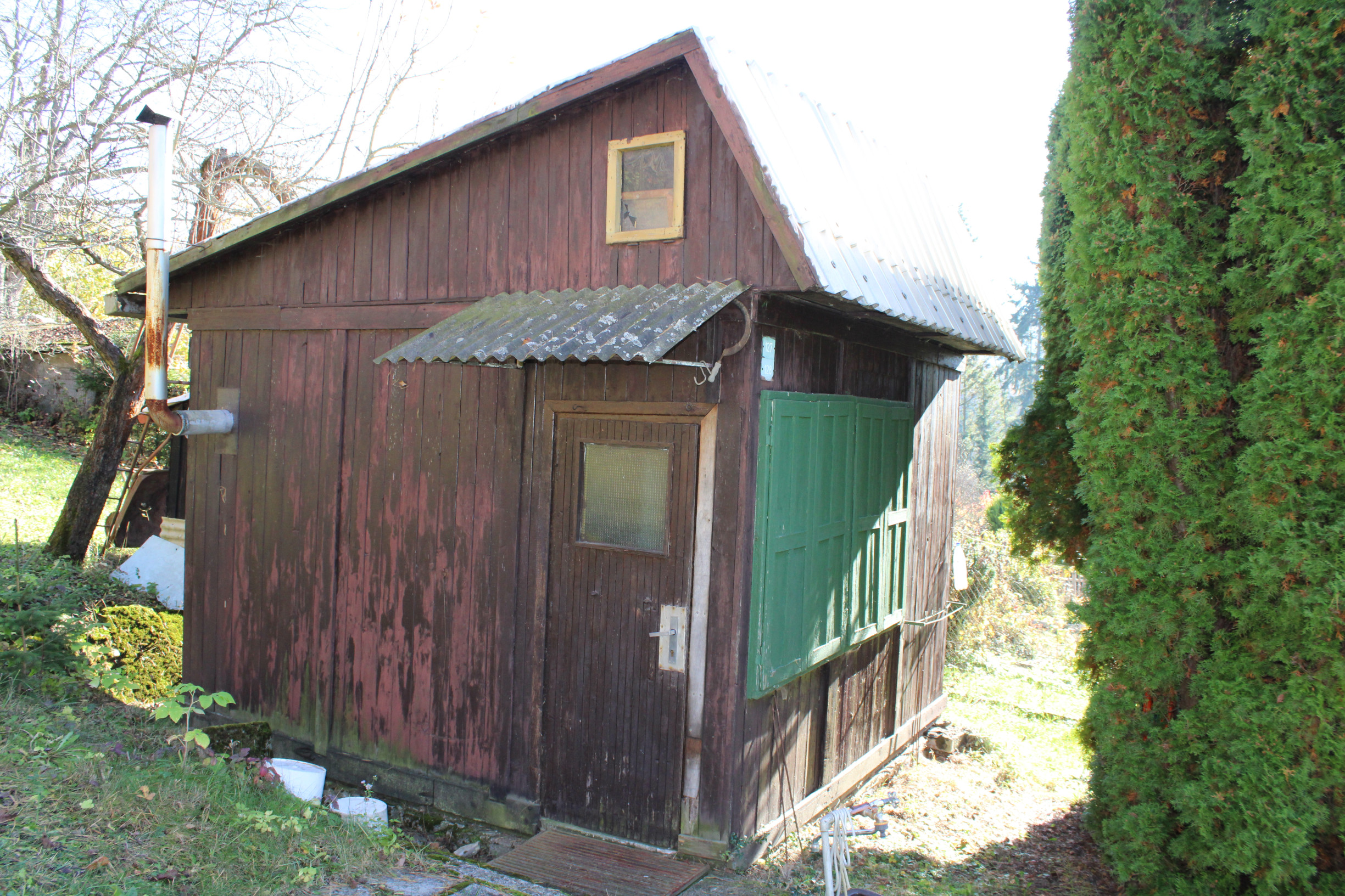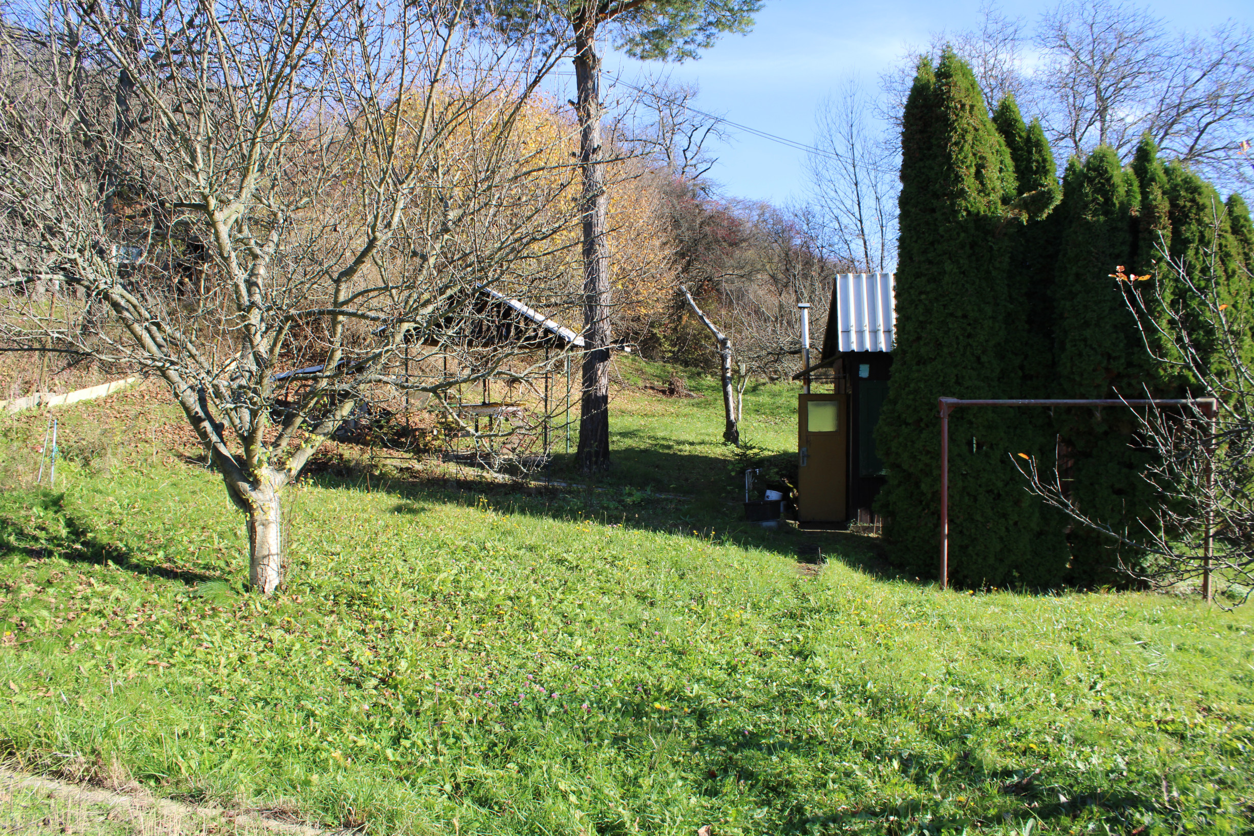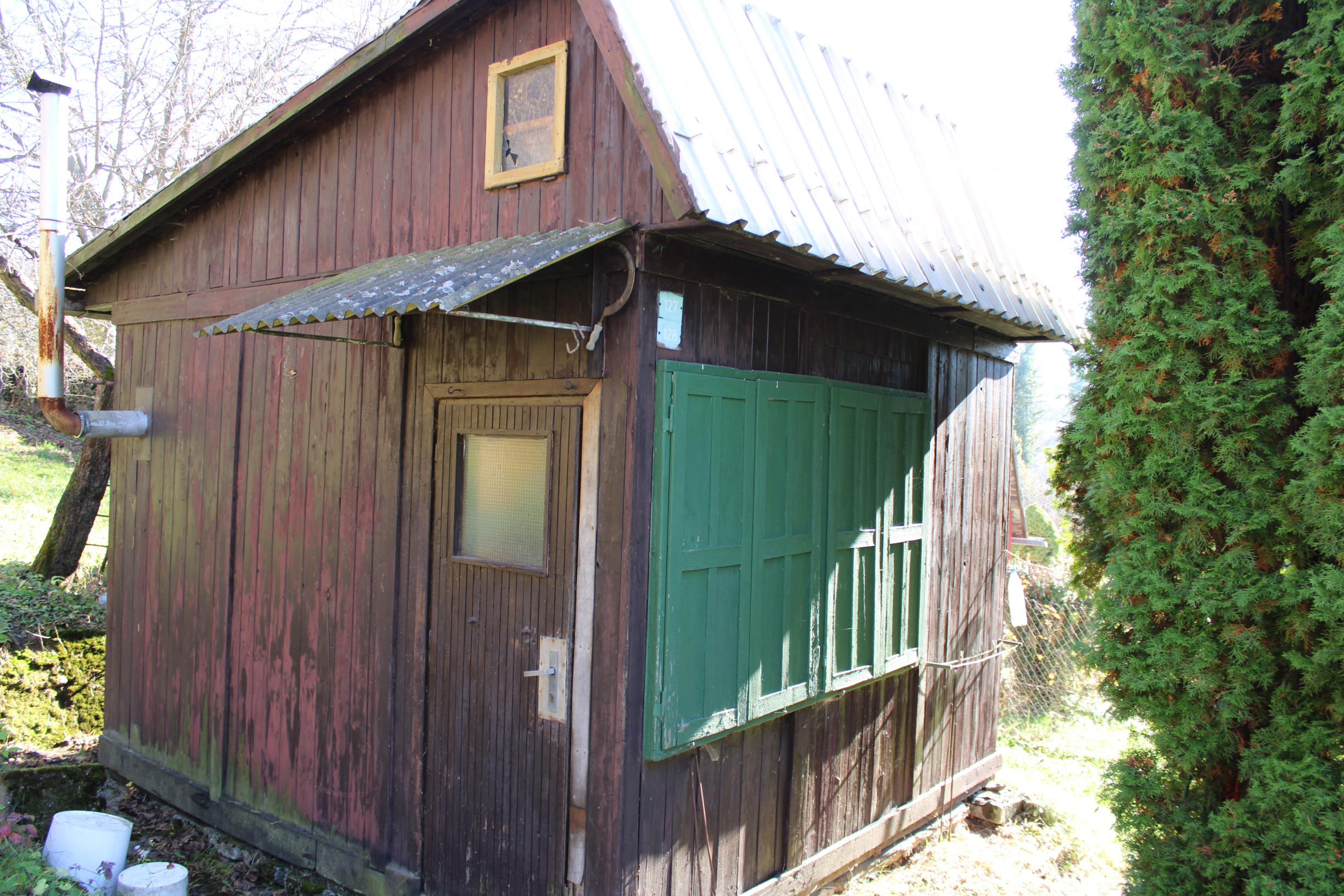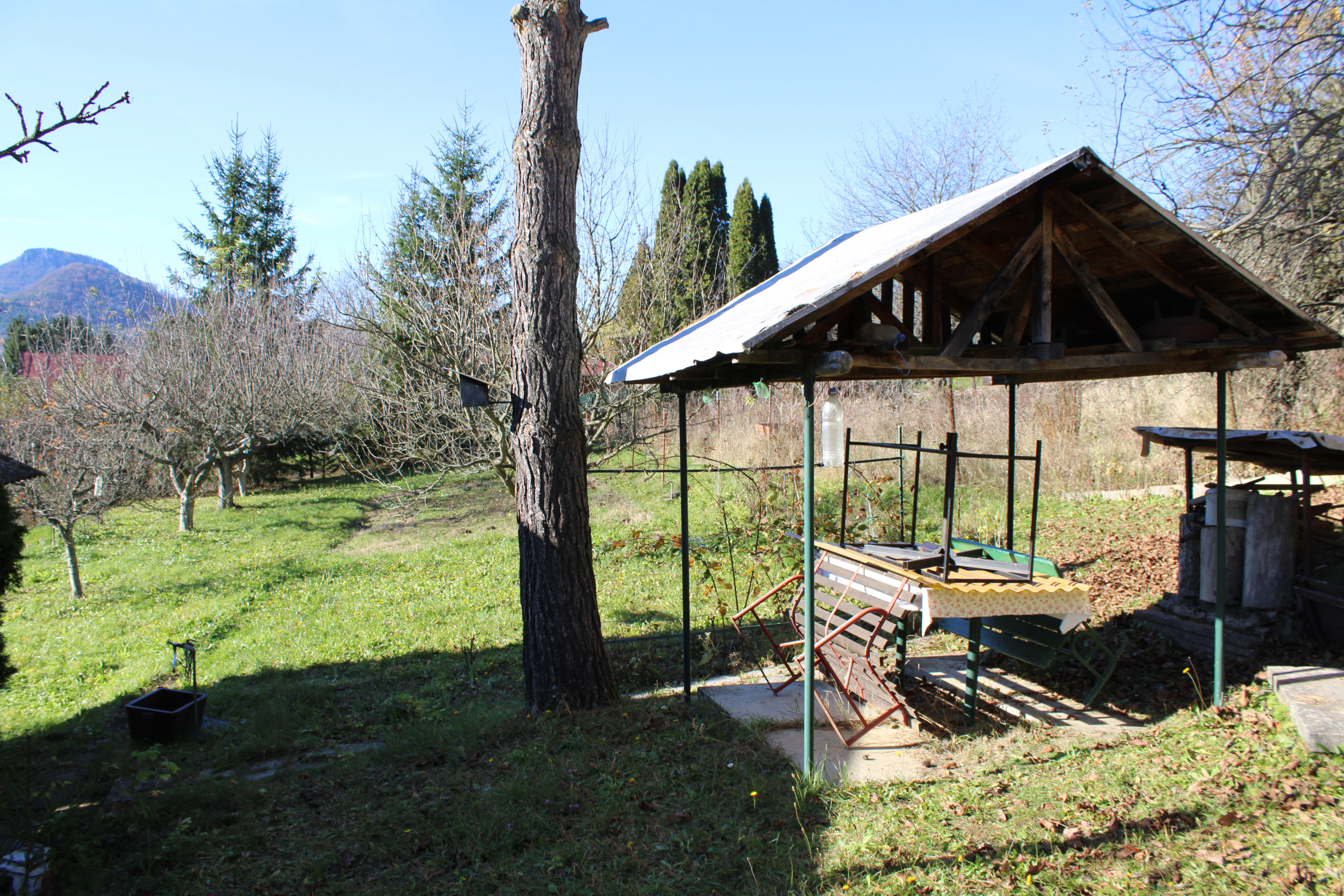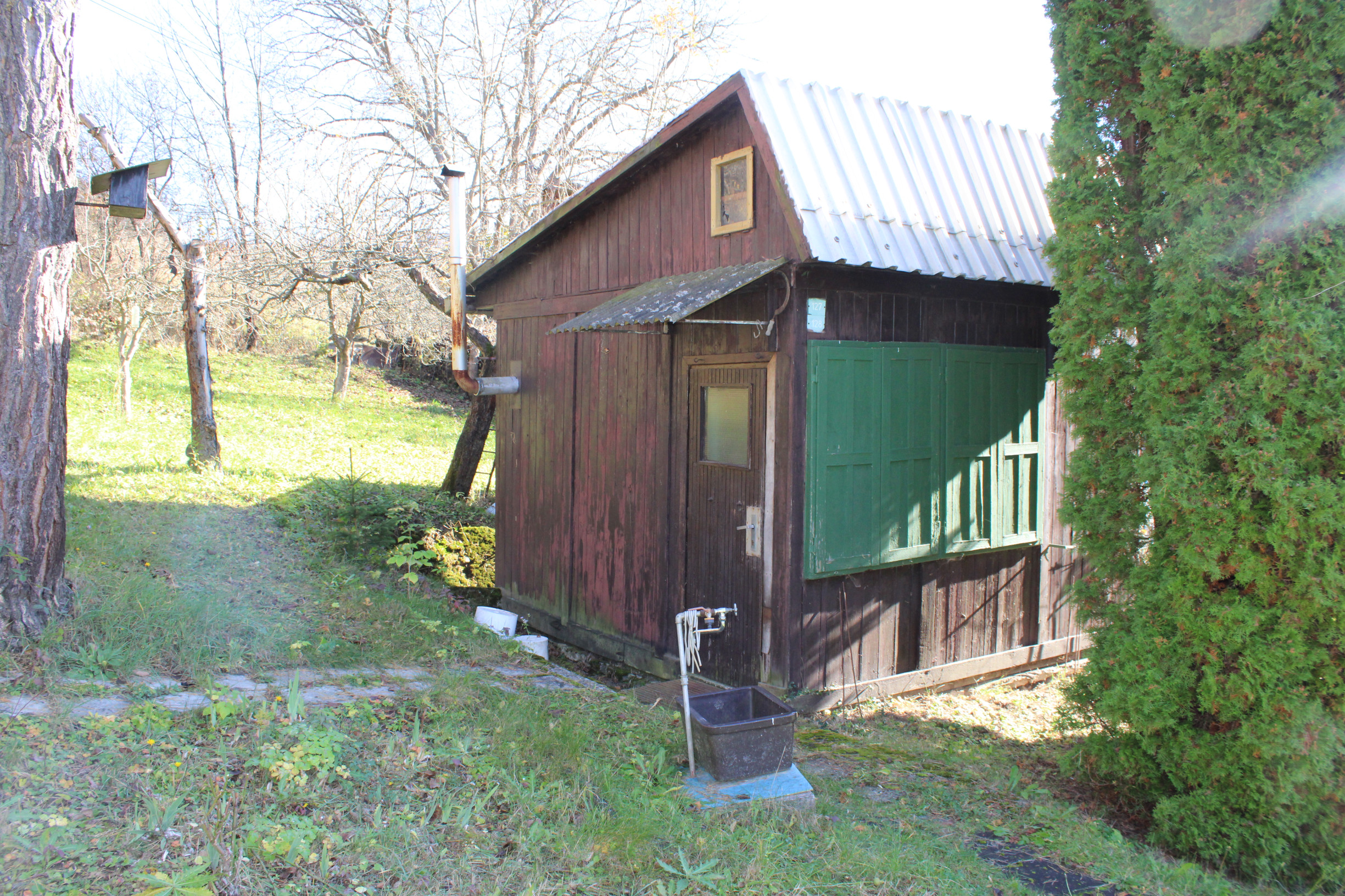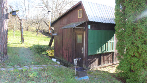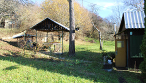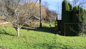 Pôvodná stavba sa nachádza v pôvodnom, ale zachovalom stave a je postavená na betónovom základe s kompletne drevenou konštrukciou. Chatka má sedlovú strechu s pozinkovanou krytinou, komínom a povalovým úložným priestorom, ktorý poskytuje dodatočné miesto na uskladnenie. Objekt je vybavený pôvodnými drevenými oknami s okenicami a vstupnými dverami, ktoré zachovávajú autentický vidiecky charakter. Za chatou sa nachádza praktická drevená šopa na náradie, ktorá slúži na uskladnenie záhradného vybavenia. Pozemok je doplnený záhradnou podzemnou pivnicou na uskladnenie ovocia a zeleniny a dreveným altánkom s posedením, ideálnym na relaxáciu v prírode. Celý pozemok je kompletne oplotený, rovinný, slnečný a udržiavaný, čo zabezpečuje súkromie a pohodlie. Záhrada je osadená ovocnými stromami vrátane jabloní a sliviek, ako aj kríkmi hrozna a ríbezlí, ktoré poskytujú možnosť pestovania vlastného ovocia.