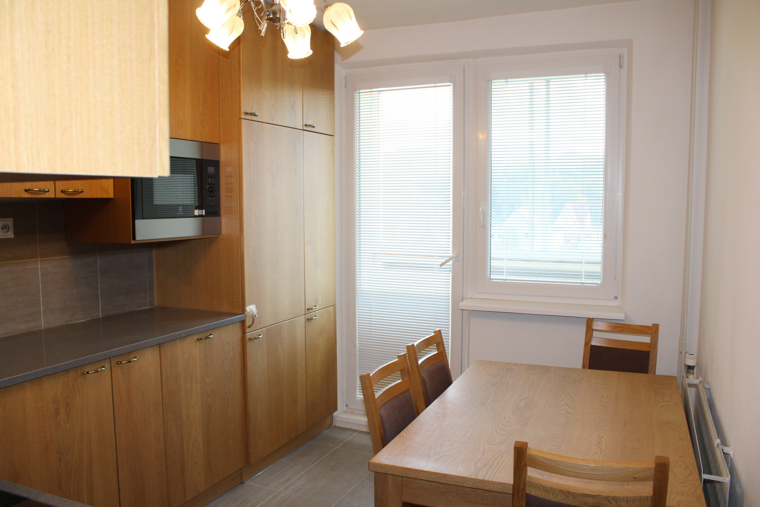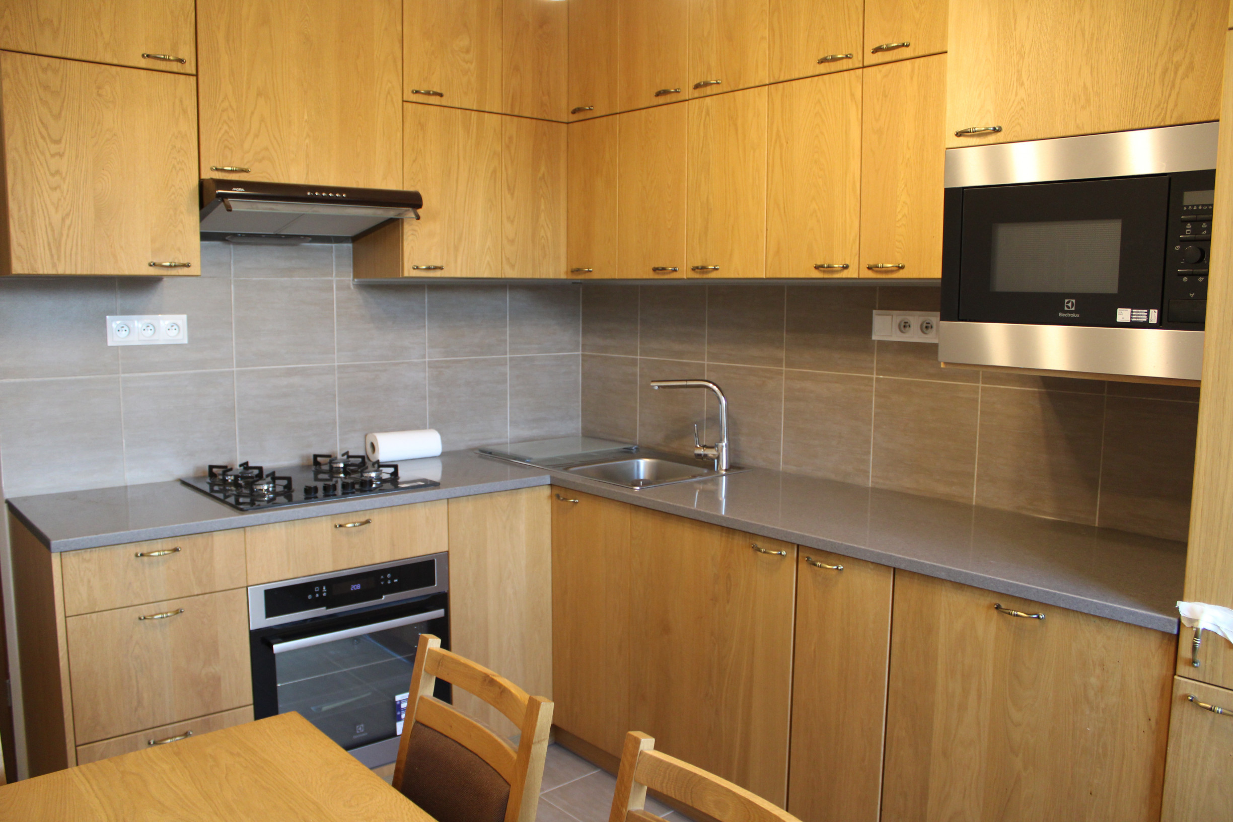 - Výbavou bytu je kuchynská linka na mieru s drezom, so zabudovanými spotrebičmi, plynový sporák+ elektrická rúra, digestor, umývačka riadu zn. BOSCH, mikrovlnka, zabudovaná chladnička kombinovaná s mrazničkou.