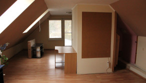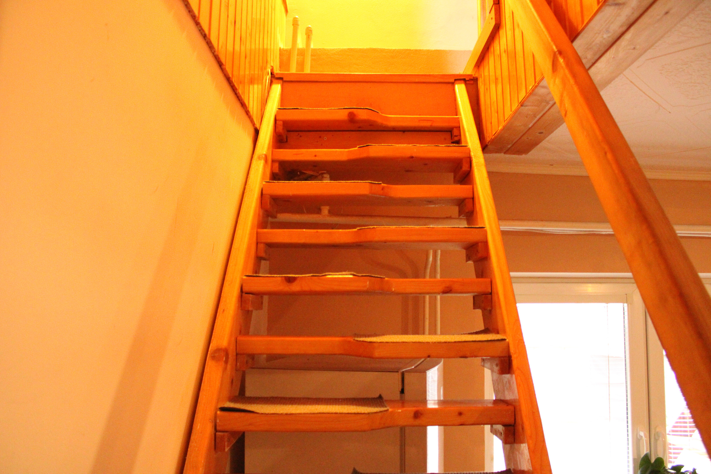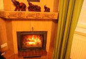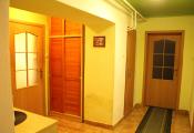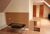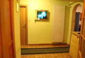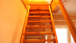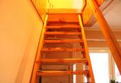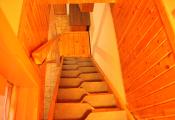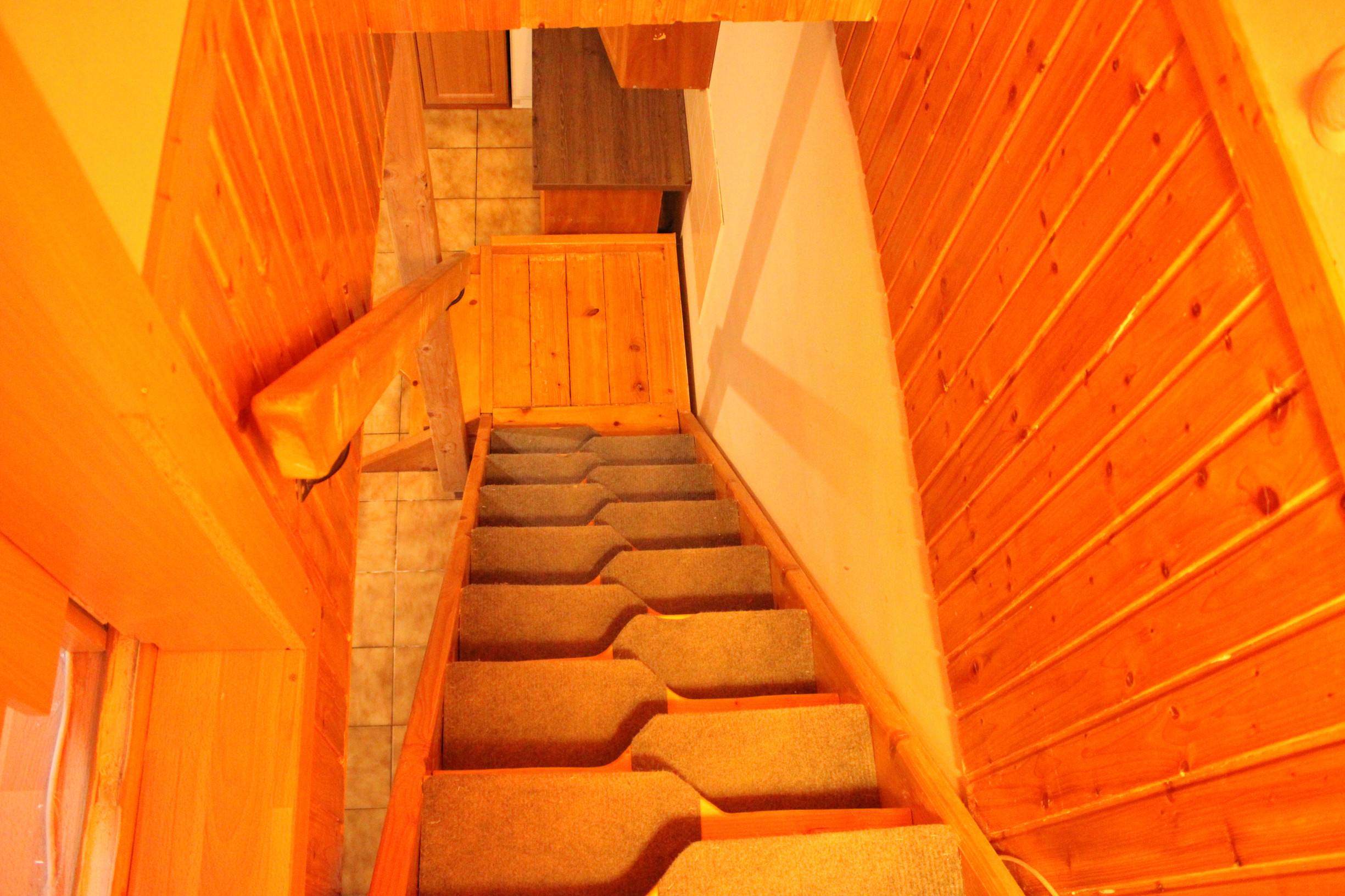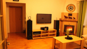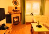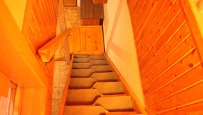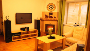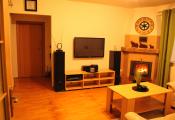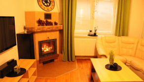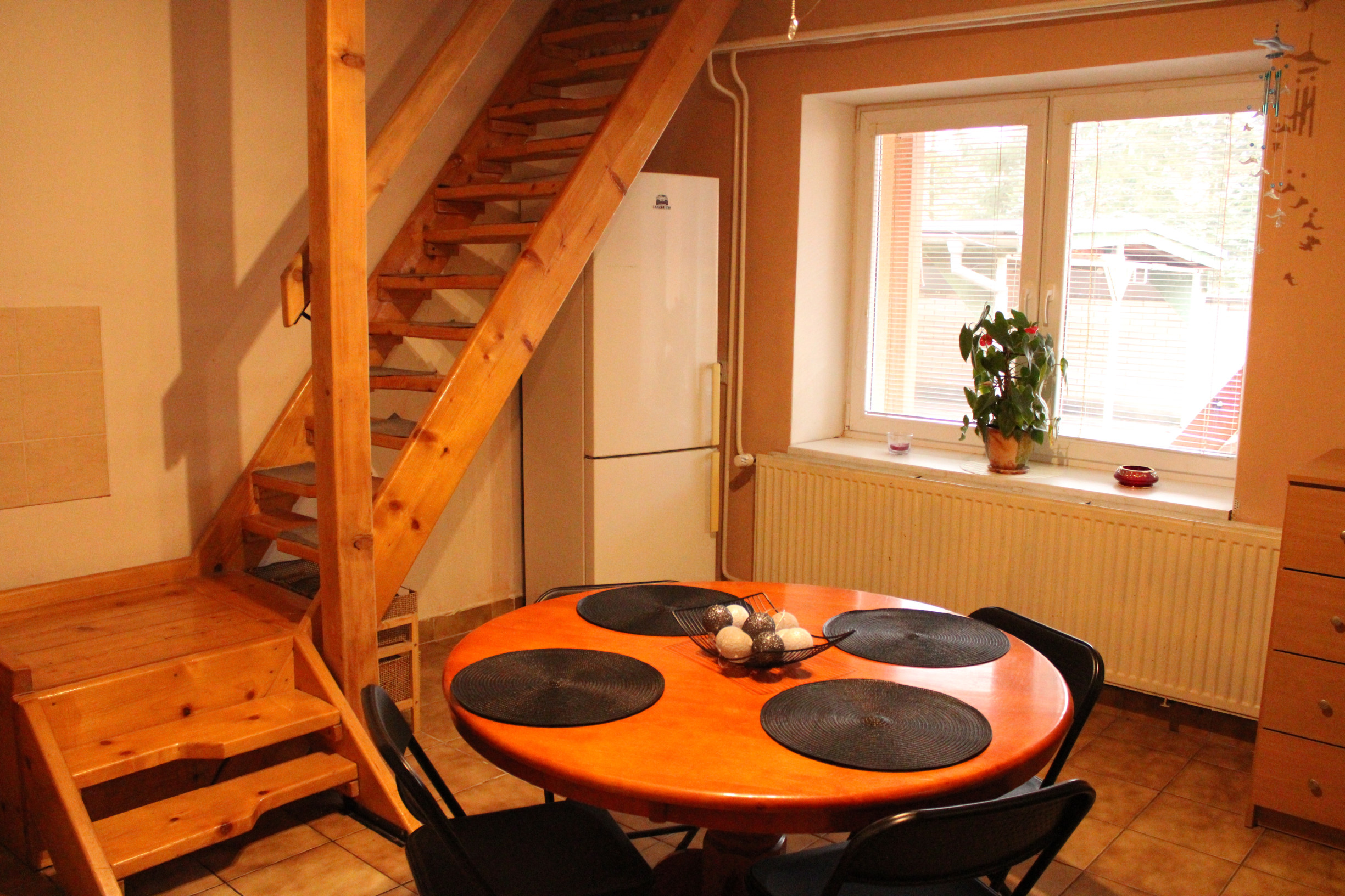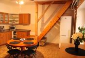 **Prízemie:** Hlavný vstup vedie do vstupnej predsieni a chodby, z ktorej sa vpravo nachádza vstup do kuchyne. Z kuchyne vedie drevené schodisko na podkrovie. Oproti vstupným dverám sa nachádza kompletne vybavená kúpeľňa so sprchovacím kútom, vaňou, zrkadlom a kúpeľňovým nábytkom. Oddelené riešené WC. Vľavo od vstupu sa nachádza obývacia miestnosť s krbom, ktorá slúži ako prechod do ďalších obytných priestorov - samostatnej spálne s výstupom na balkón a detskej izby. Na prízemí sa tiež nachádza praktický priestor určený na šatník.