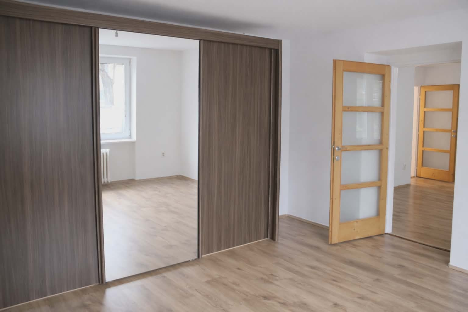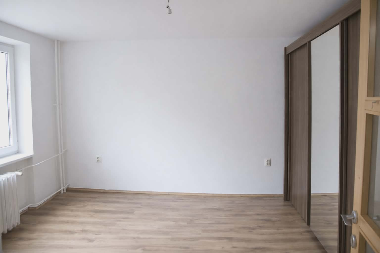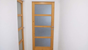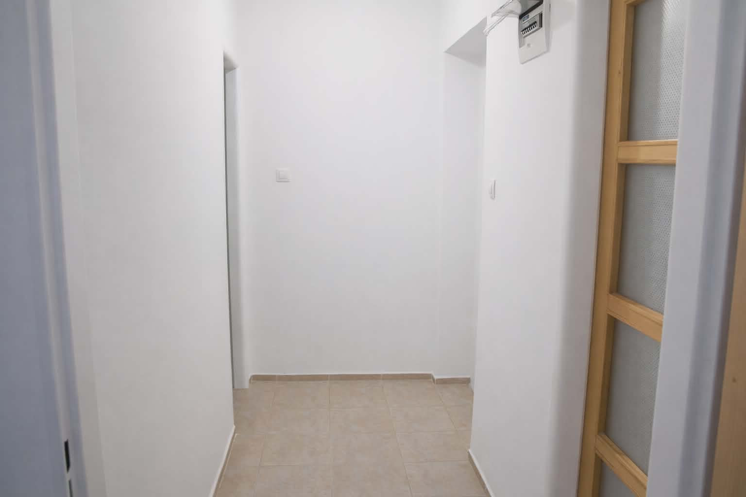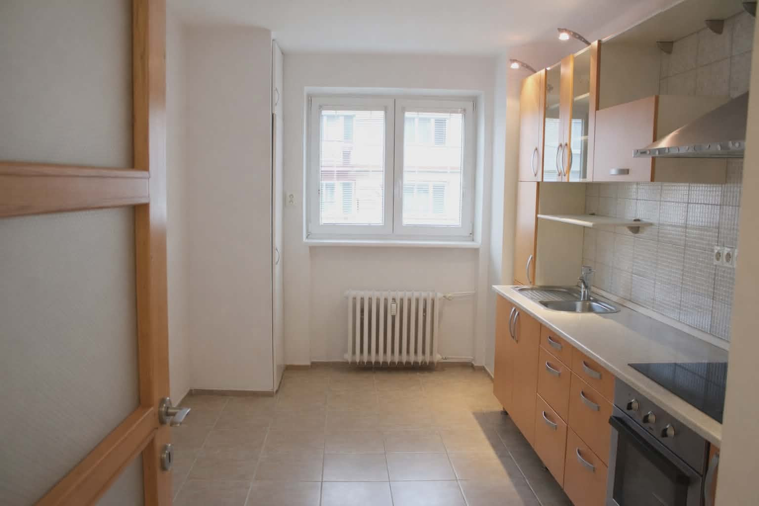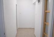 Dispozícia bytu je prakticky navrhnutá: vstupná chodba poskytuje dostatok priestoru. Vľavo sa nachádza vstup do kuchyne, ktorá je plne vybavená kuchynskou linkou, sporákom, digestorom a praktickou potravinovou skriňou. Priamo oproti vstupným dverám je kúpeľňové jadro s WC, vaňou, umývadlom a samostatným sprchovacím kútom. Z chodby sa ďalej vchádza do troch obytných izieb. Jedna z izieb je priechodná, čo ponúka flexibilitu pri využití priestoru. V jednej z obytných izieb je navyše vstavaná skriňa na mieru, ktorá maximalizuje úložný priestor.